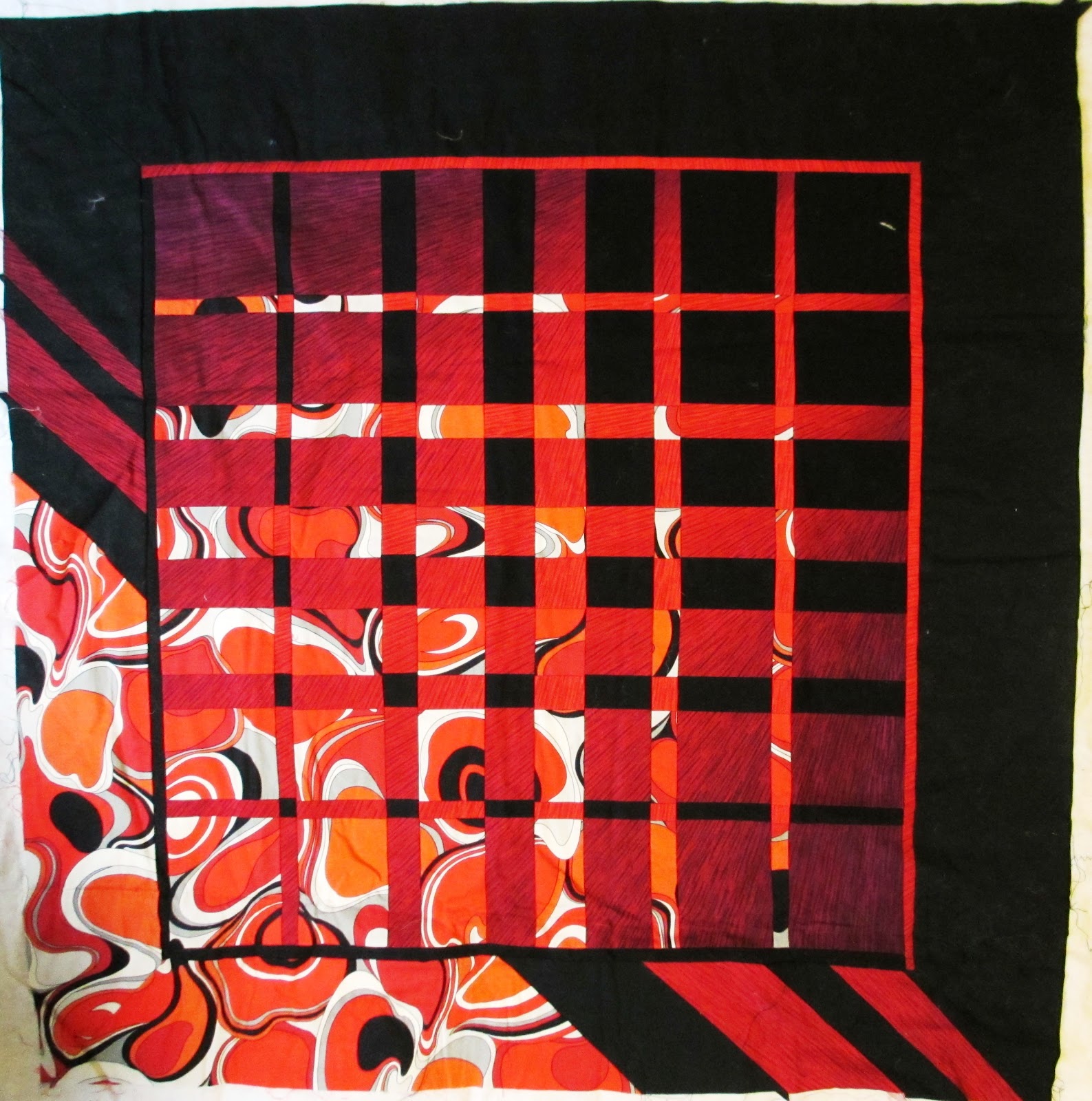 Well, here is a blast from the past! I completely forgot this quilt and how I wanted to finish it! And I actually really liked it. It is one of the Ricky Tims’ Convergence quilts made with a really wild piece fabric, some red color gradation fabric and black. I even remember I had a name for it – AMORE! Why? I remember that while I was designing and sewing this one, I watched and listened to Andrea Bocelli’s new CD and live concert (on our PBS station) called Amore – full of romantic, love songs – how apropriate, don’t you think? LOL